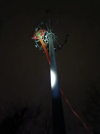 距測(cè)量,高桿燈高達(dá)30米,當(dāng)時(shí)天色已黑,技術(shù)人員從來(lái)沒有在晚上進(jìn)行過高桿燈升降的先例,安全風(fēng)險(xiǎn)、技術(shù)可行性都要進(jìn)行評(píng)估。但是根據(jù)天氣預(yù)報(bào),第二天風(fēng)力將從三級(jí)到六級(jí)、陰轉(zhuǎn)小雨,操作難度將更大,而且夜間幾個(gè)小時(shí)隨時(shí)可能引發(fā)安全事故。為了消除隱患保障安全,嘉興管理中心機(jī)電信息處負(fù)責(zé)人與上海高鐵相關(guān)人員也來(lái)到現(xiàn)場(chǎng),在確定消防車和無(wú)人機(jī)等方案都不可行的情況下,經(jīng)過現(xiàn)場(chǎng)反復(fù)推敲商定,決定在晚上采取有人安全旁站、照明許可的情況下,降下高桿燈,取下風(fēng)箏,消除隱患的解決方式。同時(shí),為了最大程度保障司乘安全,減小安全風(fēng)險(xiǎn),避免高桿燈在升起過程中發(fā)生脫鉤,并決定第二天天亮后再升起高桿燈。